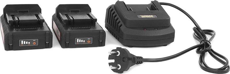 - 2 съемных Li-ion аккумулятора напряжением 20 В, емкостью 2,0 Ач снабжены собственной системой индикации уровня заряда