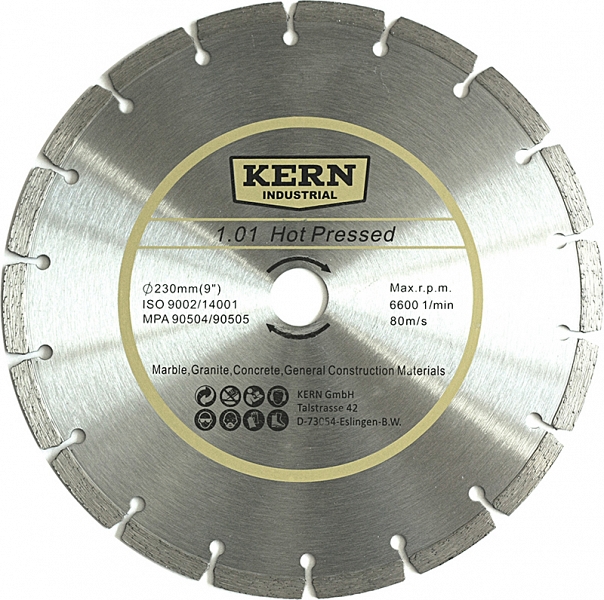 Алмазный диск Kern 1.01 Hot Pressed 302 мм (Керн 1.01 Хот Прессед 302 мм) – отрезной сегментный алмазный круг для сухой алмазной резки бетона, гранита, мрамора, а также армированного бетона (железобетона), мостового бетона, старого бетона, полимерного бетона, промывного бетона, бетонных блоков, спрессованного силикатного кирпича, глиняного кирпича, базальта, габбро, сланца, порфира, дорожного клинкера, твердообожженого клинкера, бордюрного камня, твердого камня, натурального камня (гранита, гнейса и т.п.), искусственного камня, тротуарной плитки, известняка (мрамора, терраццо и т.п.), гончарных материалов, шифера, голландской черепицы, серого чугуна, гипсокартона, керамических стекловидных труб, стеклопластика, твердых огнеупоров и других общестроительных материалов. Применяется на плиткорезах электрических, бензорезах, электрических резчиках, камнерезных станках, настольных пилах, стенорезных машинах, швонарезчиках и другой алмазной технике.