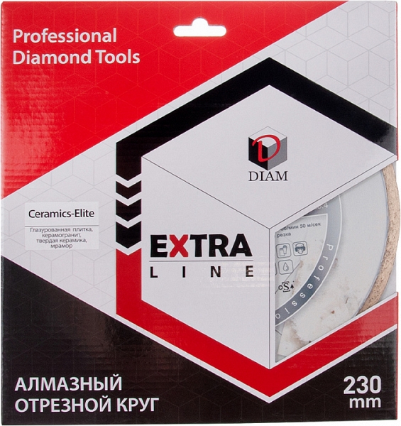 Алмазный отрезной круг Diam Extra Line 1A1R Корона Ceramics-Elite 230 мм (Диам Экстра Лайн 1А1Р Корона Керамикс-Элит 230 мм) – специальный алмазный круг со сплошной режущей кромкой для мокрой резки глазурованной плитки, твердой керамики, керамогранита, мрамора и аналогичных по своим характеристикам материалов на болгарках (ушм), штроборезах, бензорезах, электрических резчиках и плиткорезах, стенорезных машинах с подачей воды.