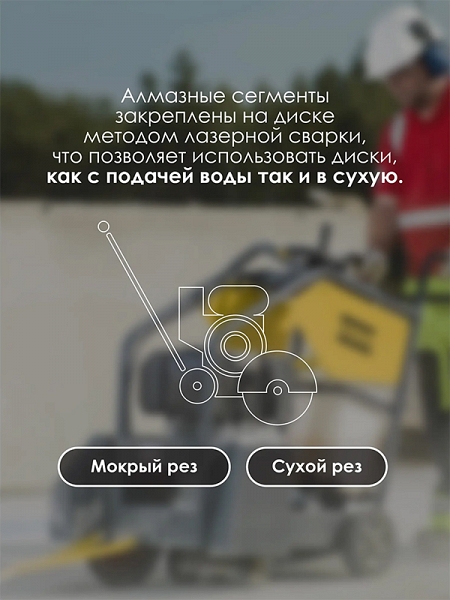 - Лазерная сварка сегментов с корпусом: алмазные сегменты закреплены на диске методом лазерной сварки, что позволяет использовать диск, как с подачей воды так и в сухую: мокрый и сухой рез (возможна работа без подачи воды)