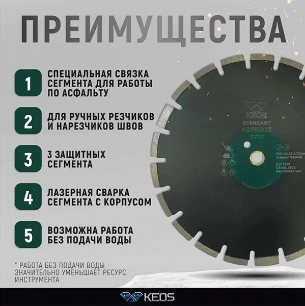 Преимущества диска алмазного сегментного по асфальту Keos Standart Asphalt 350 мм: