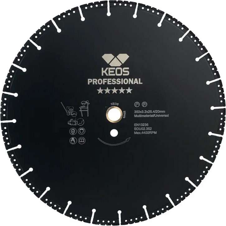 Диск алмазный универсальный Keos Professional 350 мм (Кеос Профессионал 350 мм) предназначен для резки металлов, пластика, резины, бетона, армированного бетона (железобетона), кирпича, древесины и т.д. бензорезами, электрическими резчиками, камнерезными станками, стенорезными машинами, швонарезчиками, как с подачей воды, так и всухую. Подходит для универсального использования, аварийно-спасательных работ и многого другого.