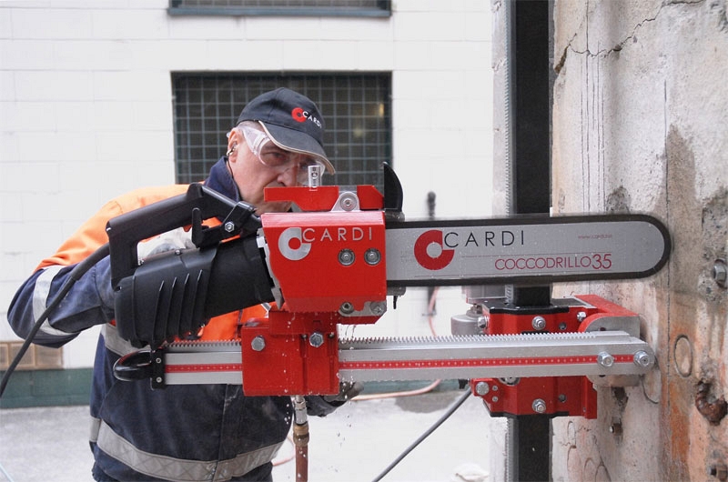Cardi Coccodrillo 35 – первая цепная пила, приводимая в движение с помощью однофазного электродвигателя, которая может резать железобетон, бетон, камень, кирпич и другие строительные материалы с использованием воды.