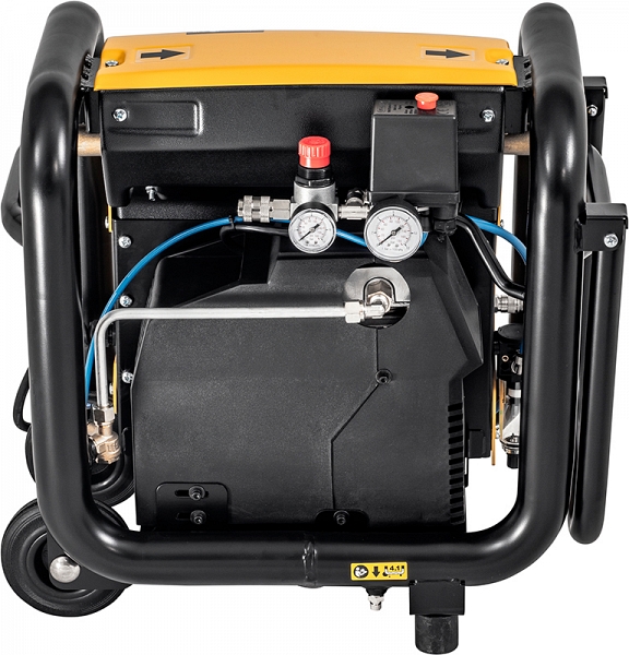 Проверенный мощный безмасляный поршневой компрессор с рычажным приводом и конденсаторным двигателем 230 В, 1500 Вт. Манометр для индикации давления воздуха в ресивере сжатого воздуха. Аварийный выключатель. - Шланги:
