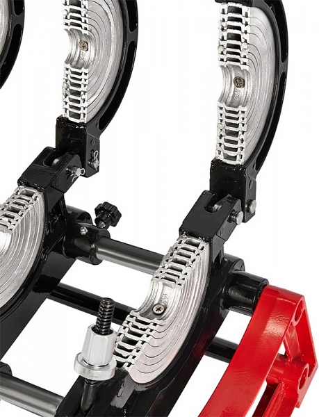- Центратор с 4-мя откидными зажимами и фиксатором имеет большой запас прочности за счет качественного сплава и ребер жесткости, что позволяет сваривать полимерные трубы с любым показателем SDR