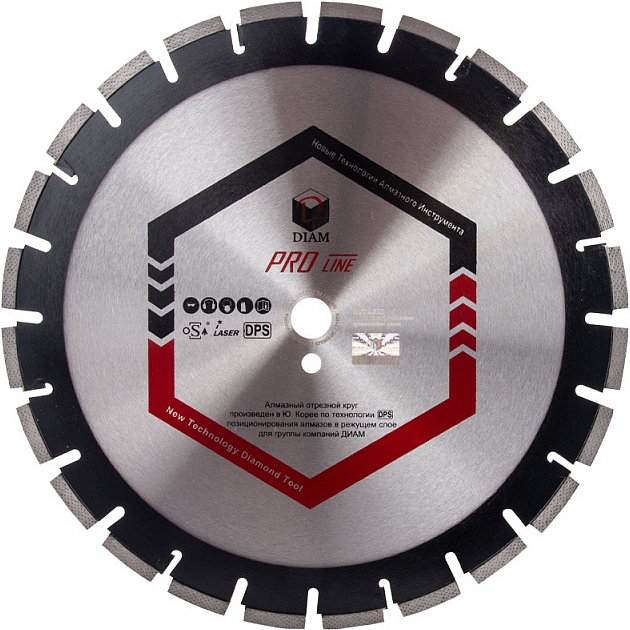 Сегментный алмазный круг Diam Pro Line 1A1RSS Асфальт 400 мм (Диам Про Лайн 1А1РСС Асфальт 400 мм) – профессиональный алмазный отрезной диск с лазерной сваркой сегментов, произведенный по технологии DPS (позиционирования алмазов в режущем слое), для сухой и мокрой резки асфальта с тяжелым наполнителем, асфальтобетона, абразивного песчаника, кирпича и других абразивов на резчиках швов, стенорезных машинах, бензорезах, электрических резчиках, камнерезных станках и другом оборудовании, как с водяных охлаждением, так и без него.