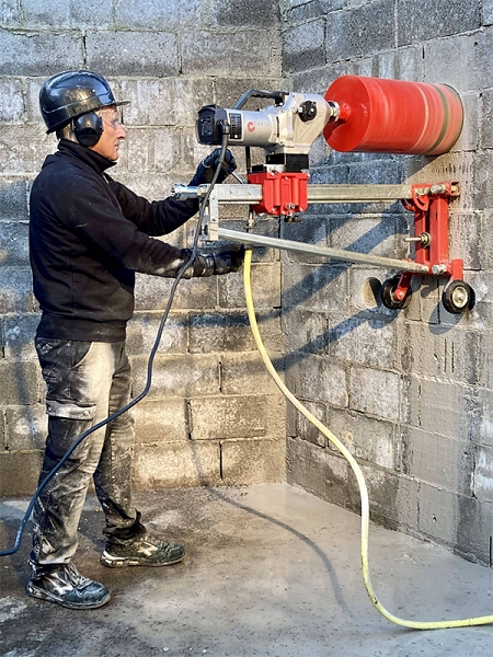 - Стальная наклонная колонна крепится на шарнирах к опорной плите и имеет дополнительный упор для большей жесткости, возможность алмазного сверления отверстий под углом от 0° до 75°