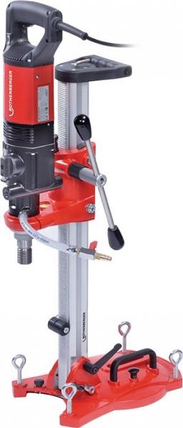Установка алмазного бурения Rothenberger Rodiacut 150 (Ротенбергер Родиакат 150) – полностью оснащенная сверлильная система с комбинированным основанием-станиной (анкерно-вакуумное крепление), указателем середины отверстия, вспомогательными устройствами для нивелирования, ограничителем глубины для сверления отверстий Ø 10 – 152 мм в железобетоне (армированном бетоне), Ø 10 – 250 мм в кирпиче, под прямым углом и под углом до 45°.